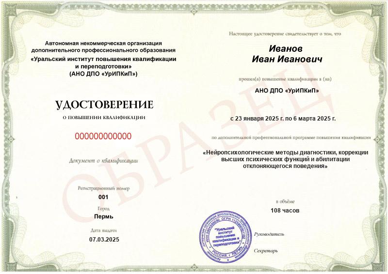 - Образец удостоверения о повышении квалификации.