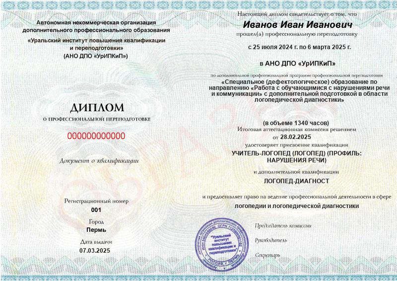 Специальное (дефектологическое) образование по направлению «Работа с обучающимися с нарушениями речи и коммуникации» с дополнительной подготовкой в области логопедической диагностики (1340ч)