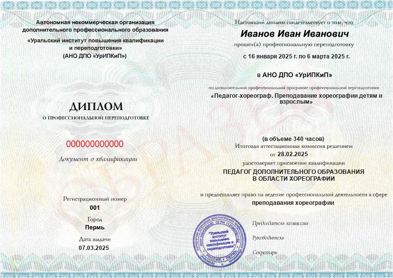 • Квалификация: Педагог дополнительного образования в области хореографии