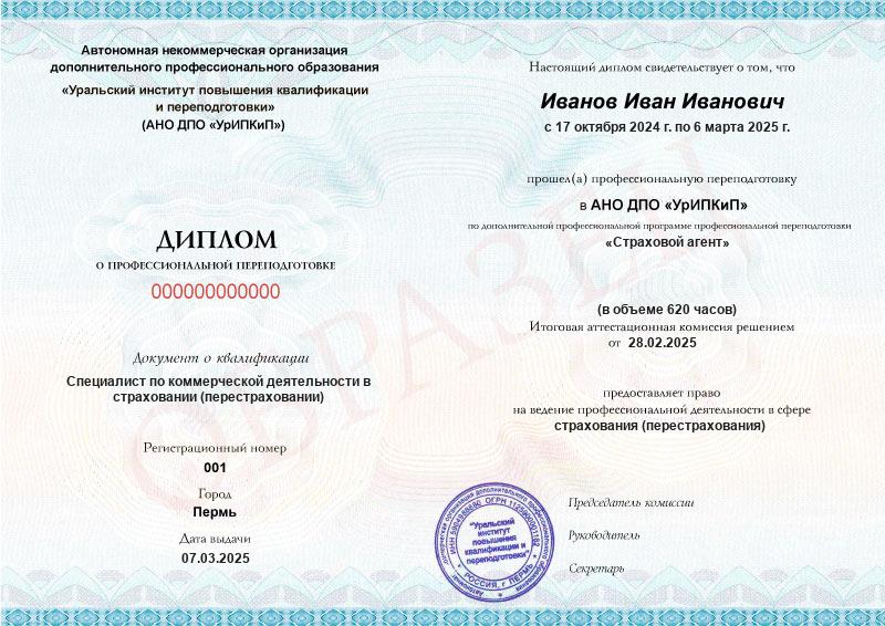 - Квалификация: Специалист по коммерческой деятельности в страховании (перестраховании)