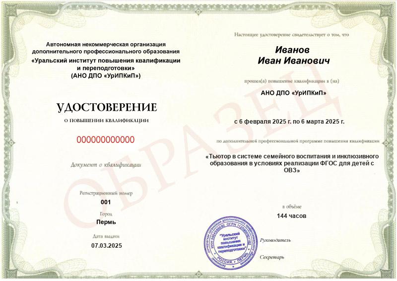 - Образец удостоверения о повышении квалификации.