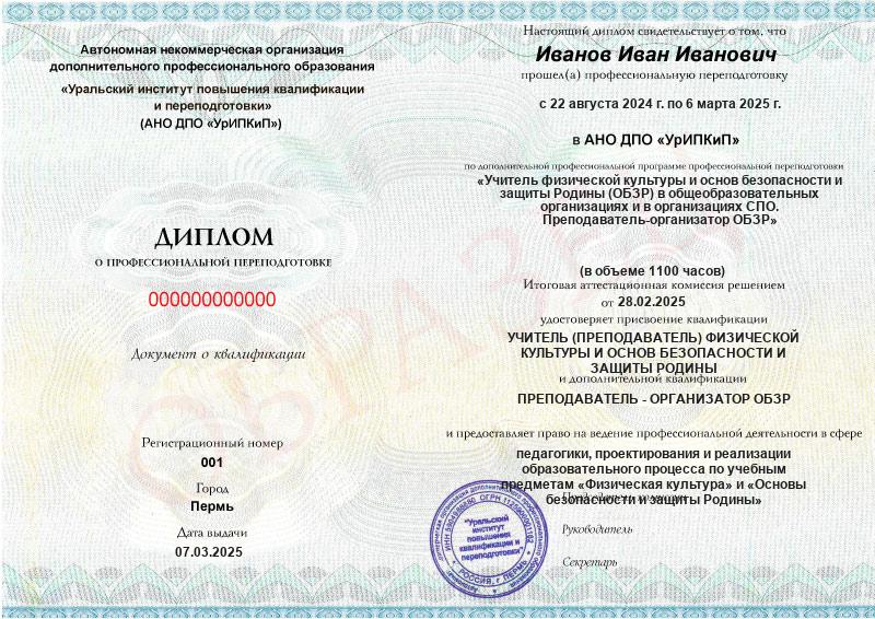 Учитель физической культуры и основ безопасности и защиты Родины (ОБЗР) в общеобразовательных организациях и в организациях СПО. Преподаватель-организатор ОБЗР (1100ч)